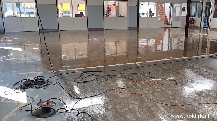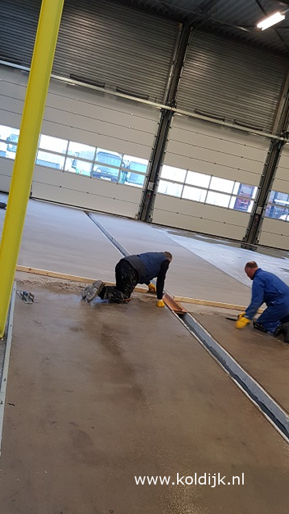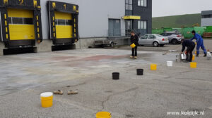 Onlangs heeft Fa. Koldijk in Heerenveen bij een transportbedrijf een afgekeurde asfaltvloer voorzien van een vloeistofdichte overlaging. Er werden in 1 dag 5 lagen aangebracht en in de namiddag kon de vloer weer in gebruik worden genomen.