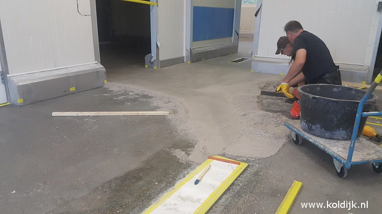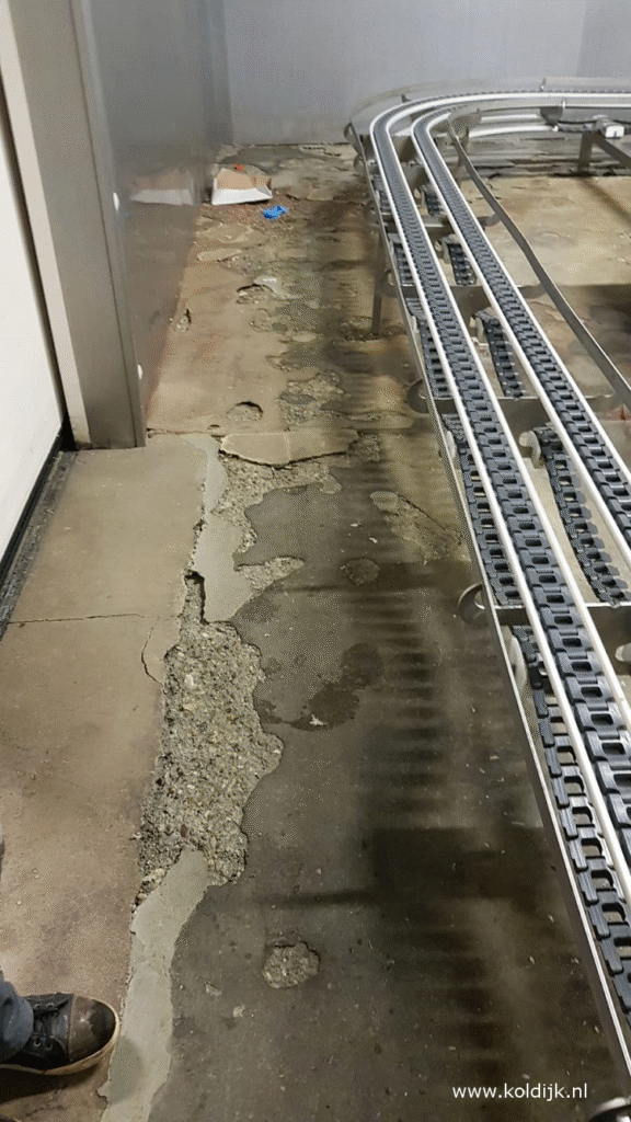 Een kapot gevroren vloer bij een kippenslachterij van 430m2 was vanwege de lopende banden lastig te bereiken, maar is keurig volgens de planning opgeleverd.